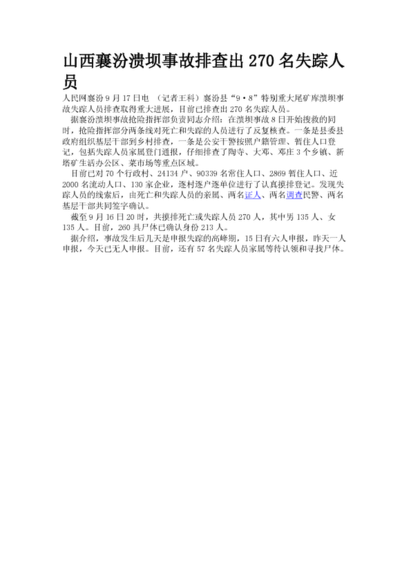 山西襄汾潰壩事故排查出270名失蹤人員(17.54KB)