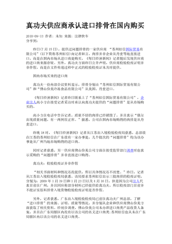 真功夫供應(yīng)商承認進口排骨在國內(nèi)購買