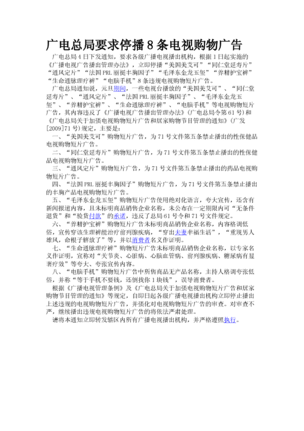 廣電總局要求停播8條電視購物廣告(21.67KB)