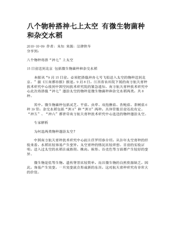 八個物種搭神七上太空 有微生物菌種和雜交水稻