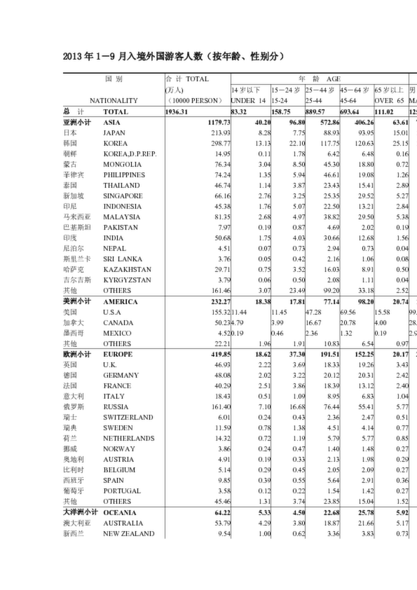 2013年1-9月入境外國游客人數(shù)(按年齡、性別分)