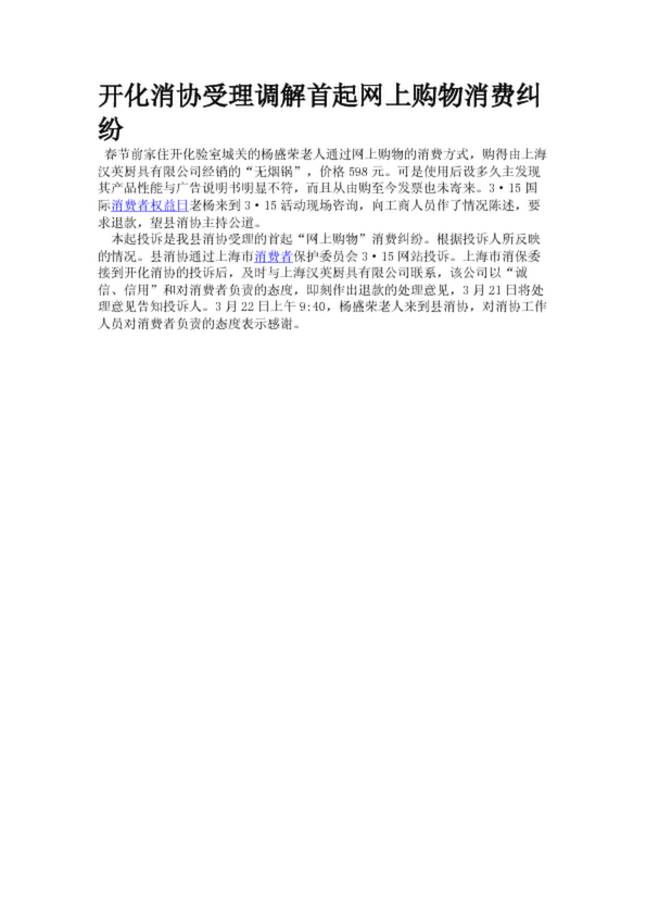 開化消協(xié)受理調(diào)解首起網(wǎng)上購物消費(fèi)糾紛