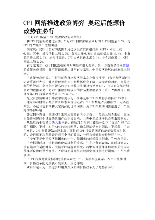 CPI回落推進政策博弈 奧運后能源價改勢在必行(20.68KB)